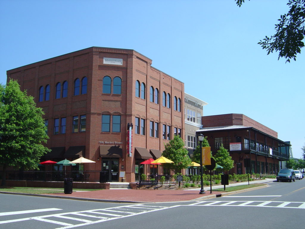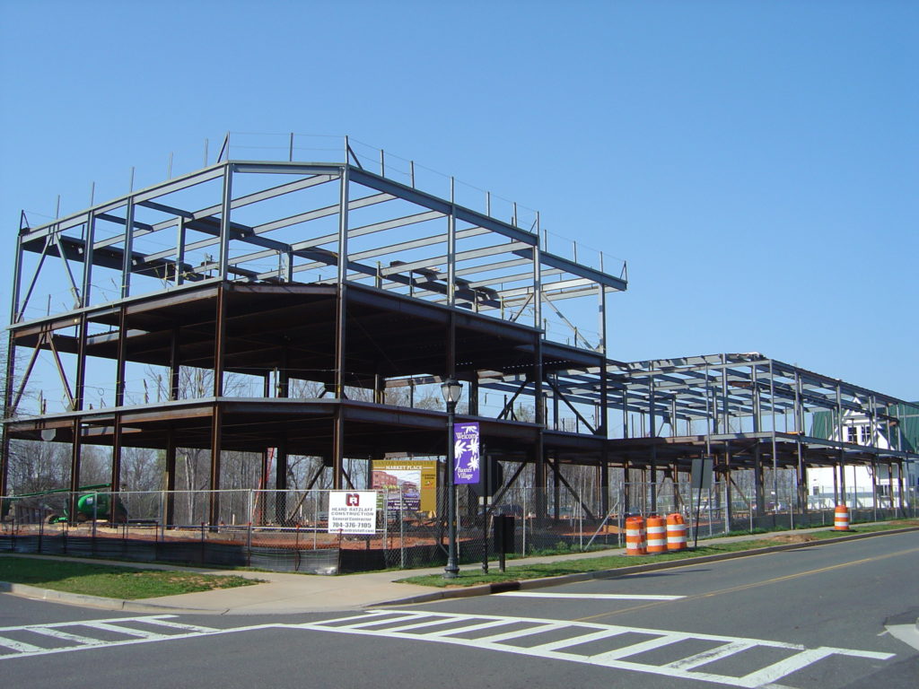 This 30,000 square foot steel framed structure features split levels, with office spaces in the upper floors and a restaurant on the bottom floor. It is located in Fort Mill, South Carolina.